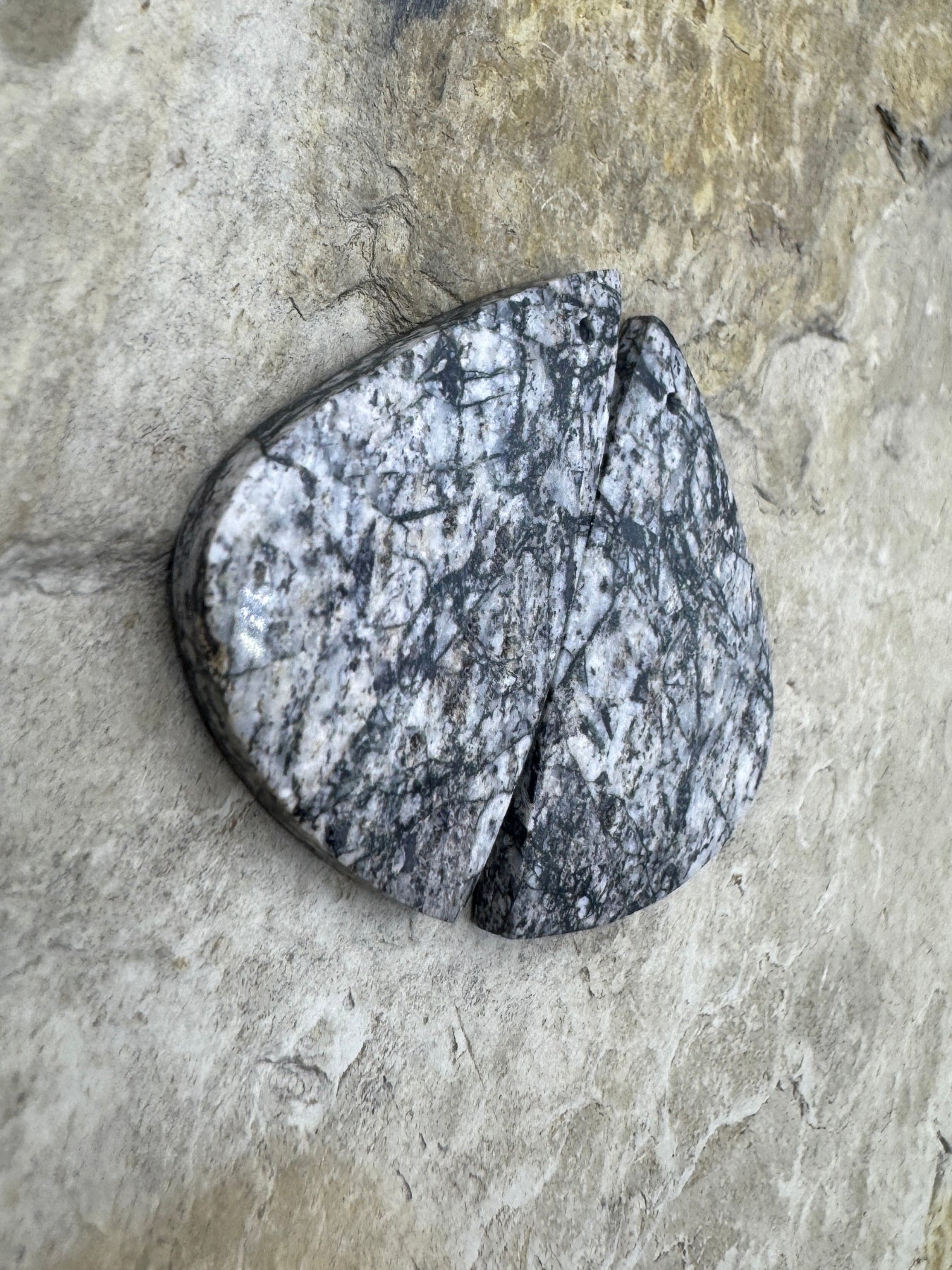 White Buffalo stone (AZ) This white buffalo stone is from a mine in Arizona. The difference between the Arizona White Buffalo and the Nevada is mostly the pattern of the black matrix in the white Dolomite stone... a lot of sellers call it White Buffalo Turquoise, but it is NOT turquoise in makeup though it was discovered in a turquoise mine. This White Buffalo is from a Mine in Arizona. The difference between the White Buffalo Stone for Arizona is the presence of the Spiderweb Patterns as compared to the Nevada White Buffalo Stone, that has bolder black matrix patterns and more solid white. The white stone is surrounded by black and brown chert which creates beautiful patterns and matrixing. Beware that howlite is is often represented as White Buffalo, but it is more of a cream white with grey erratic veining and not black. Howlite is very common and White Buffalo comes from only one mine in Nevada.