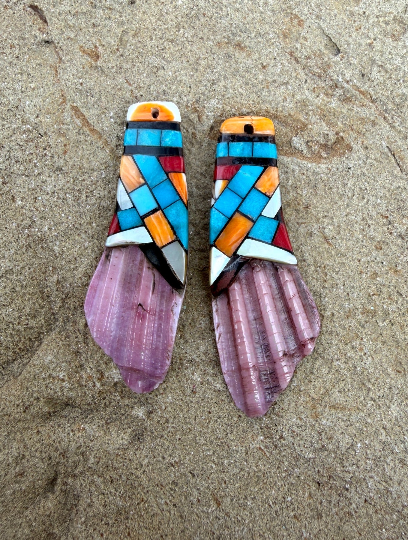 Spiny Oyster with Hand Pieced Inlay Earring Slab Bead Pair 15x47mm