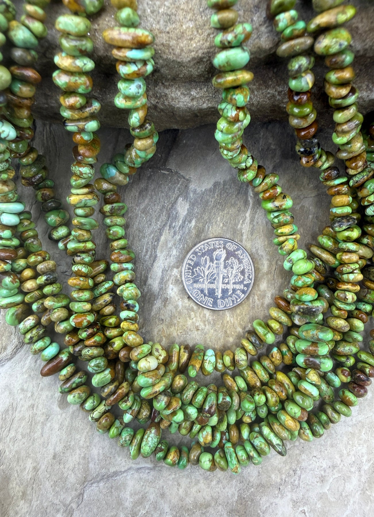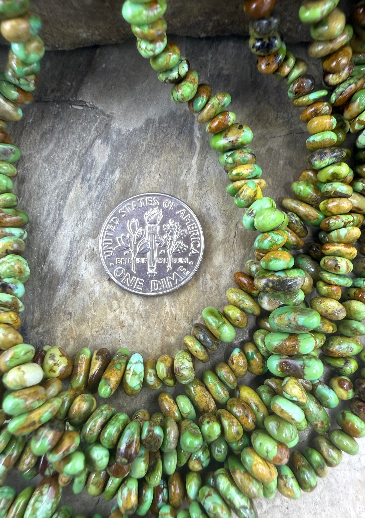 Sonoran Gold Turquoise is a recent discovery (2019) and comes from the mines near Cananea, Mexico. This turquoise does not come in veins but rather individual nuggets in a clay deposit. The colors can be spectacular, bright in tones of deep green, lime and blue/green mixed, only recently has material been found that is all blue. This turquoise sometimes has golden brown matrix but can also have lighter yellow or white matrixing where the host rock peeks through the turquoise. The color combinations and shades can vary. Because of these rich color variations this new Sonora Gold turquoise is distinctive and has a lot of character.