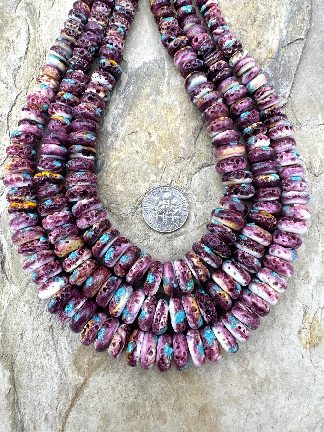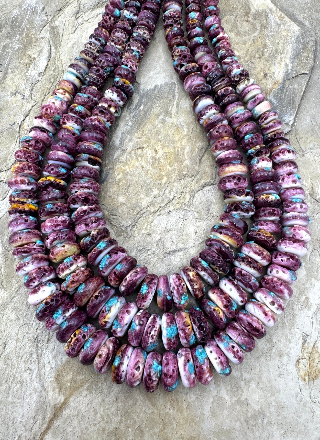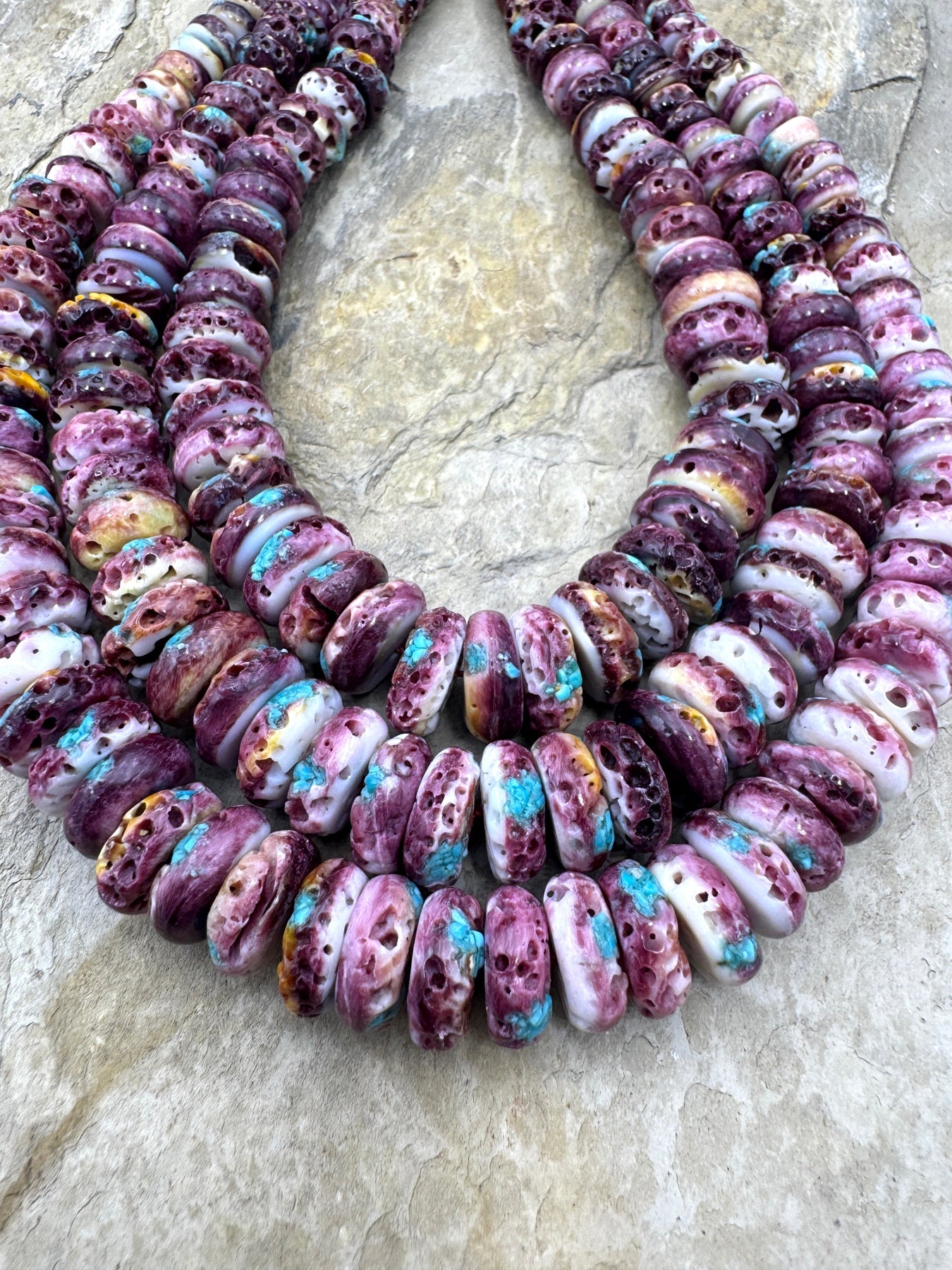 Spiny Oyster shell comes from the Sea of Cortez in Mexico and has always been a favorite of the Native American Indian jewelry artists and can be found in various shades of orange, red and purple. There are limited suppliers for the Spiny Oyster beads and cabochons and we always try to hand pick these strands to eliminate as much white on the beads as possible.