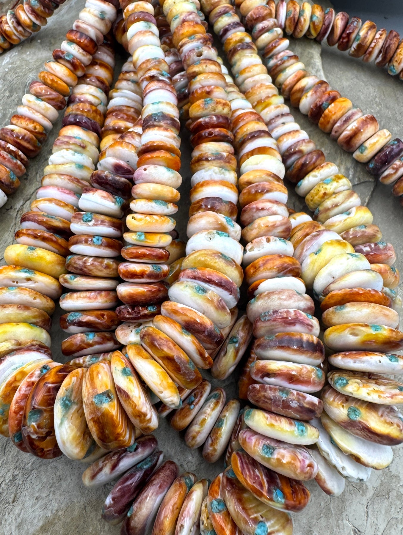 Red/Rust with Yellow Spiny Oyster with Turquoise Inlay Graduated BIG 8-20mm Rondelle Bead Strand, 16 Inch Strand