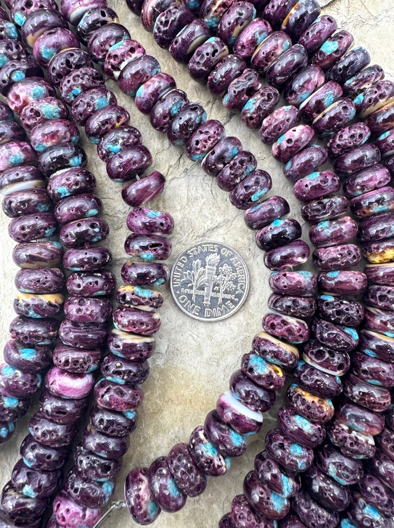 Spiny Oyster shell comes from the Sea of Cortez in Mexico and has always been a favorite of the Native American Indian jewelry artists and can be found in various shades of orange, red and purple. There are limited suppliers for the Spiny Oyster beads and cabochons and we always try to hand pick these strands to eliminate as much white on the beads as possible.