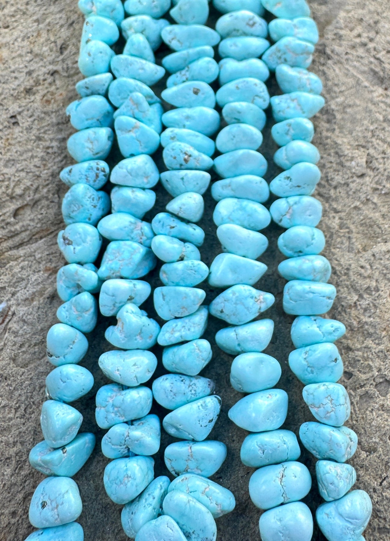 The White Creek mine is located in northeast Nevada, in the cluster of mines including Lander, No. 8, Blue Gem, Dry Creek and Fox, but has been out of production since the 80`s. This is the original "white" Turquoise, the unusually light blue color is due to the presence of Aluminum rather than copper. This is similar in coloring to the Dry Creek Turquoise that came out of the Godber mine. These stunning south western style beads measure 8to 16mm.