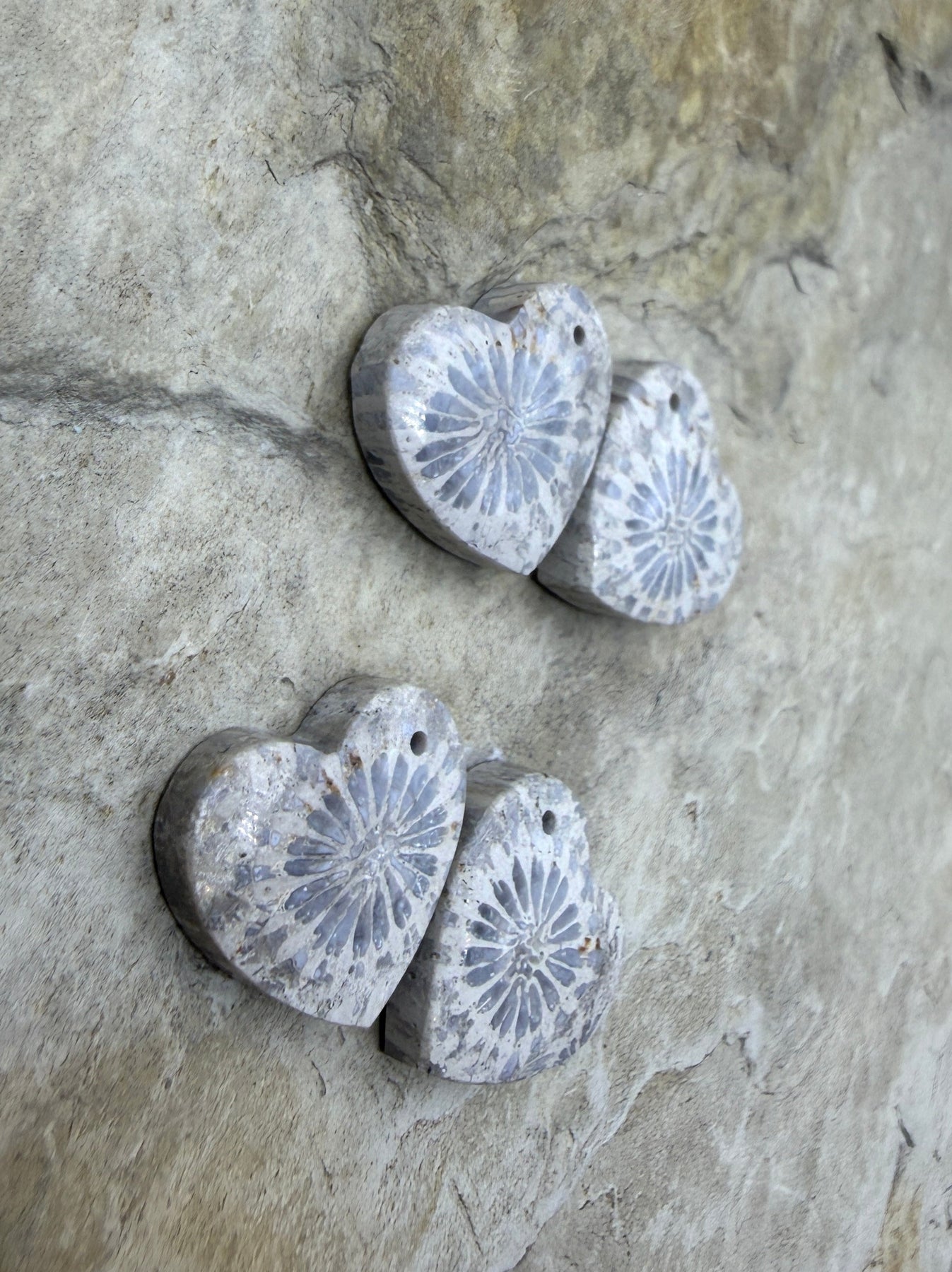 Fossil Coral Heart Shapped Matching Bead Slab Pair 15mm