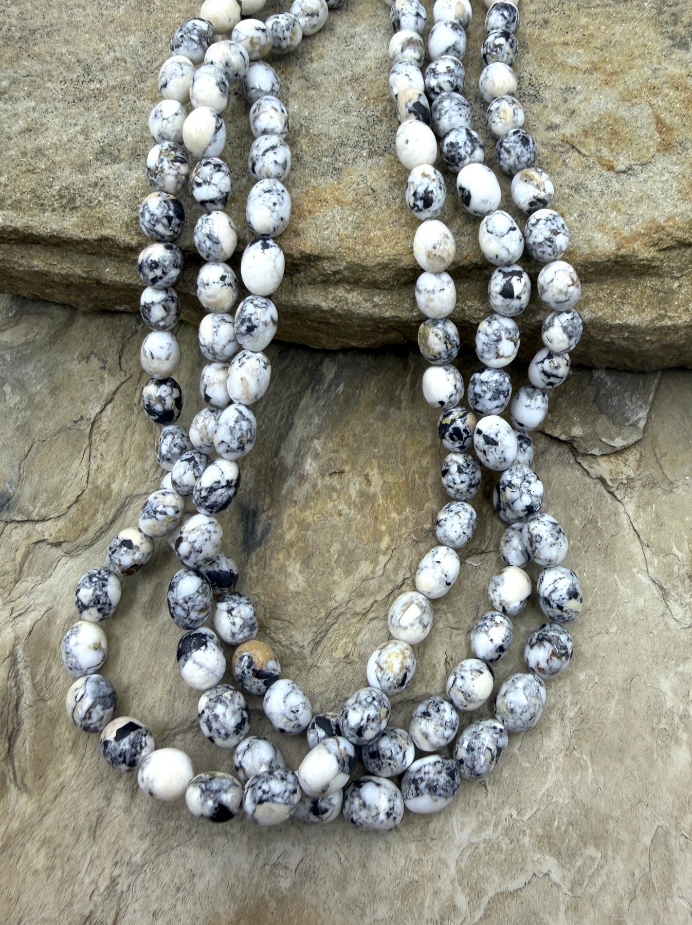 White Buffalo stone (NV) ... a lot of sellers call it White Buffalo Turquoise, but it is NOT turquoise in makeup though it was discovered in a turquoise mine in Tonapah, Nevada. The white stone is surrounded by black and brown chert which creates beautiful patterns and matrixing. Beware that howlite is is often represented as White Buffalo, but it is more of a cream white with grey erratic veining and not black. Howlite is very common and White Buffalo comes from only one mine in Nevada.